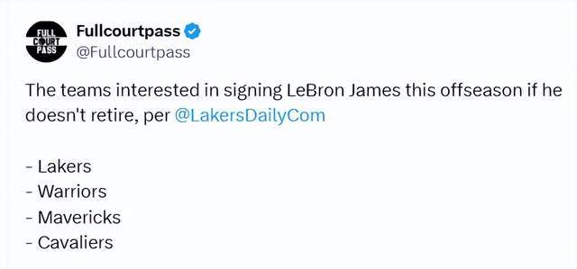 消息称,詹姆斯的现东家洛杉矶湖人队,以及金州勇士队、达拉斯独行侠队、克利夫兰骑士队,均有意在休赛期签下詹姆斯。